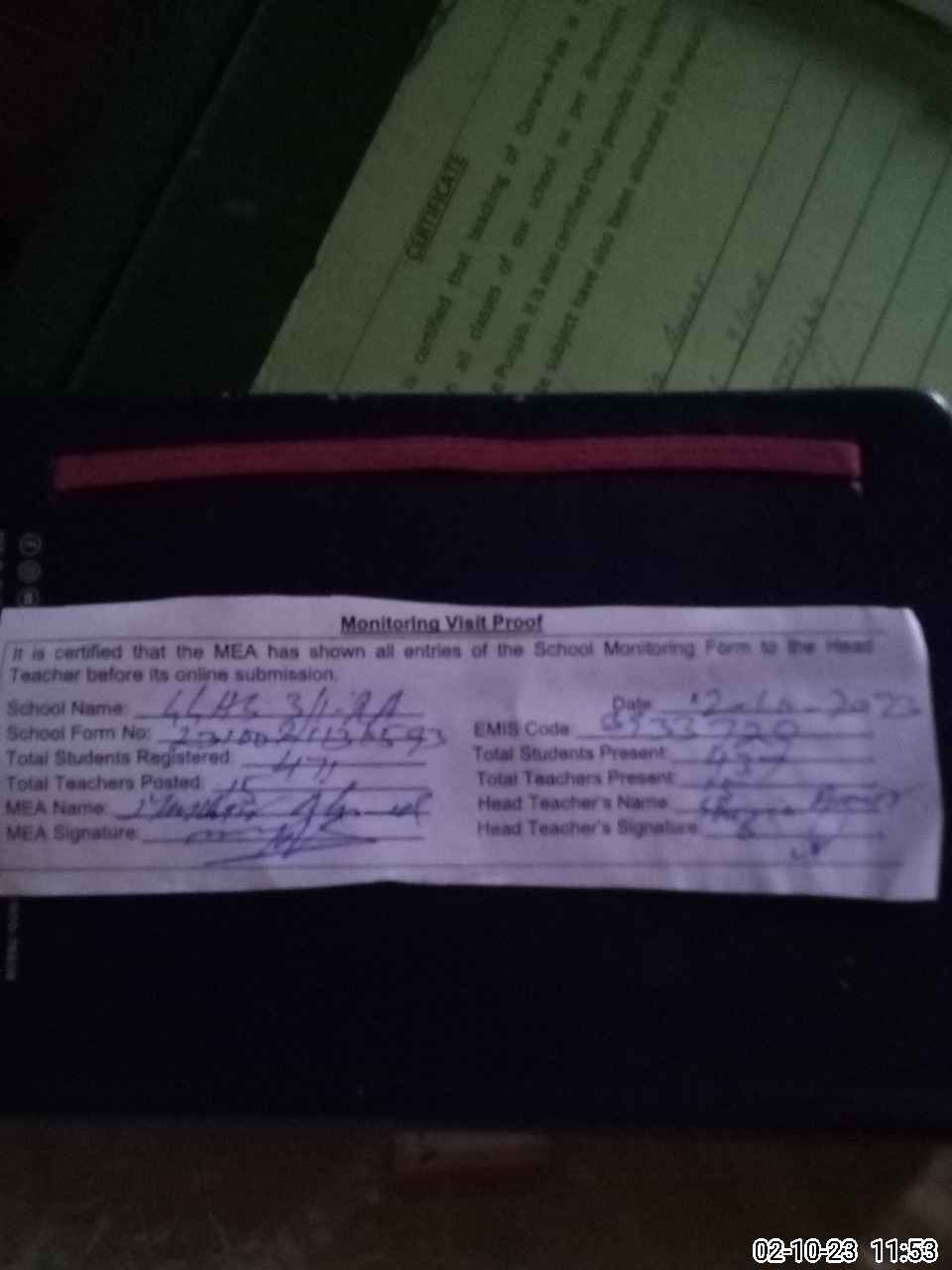 | Certified that this School was Inspected by the Undersigned MEA/DMO Today and the Information Stated Above is as Per Record. | |||||