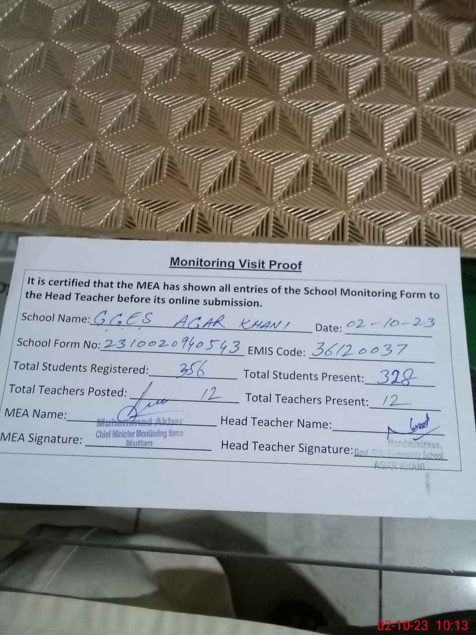 | EMIS Code: 36120037 | Name of School: GGES AGAR KHANI BASTI MAHRAM SHUJABAD | |||