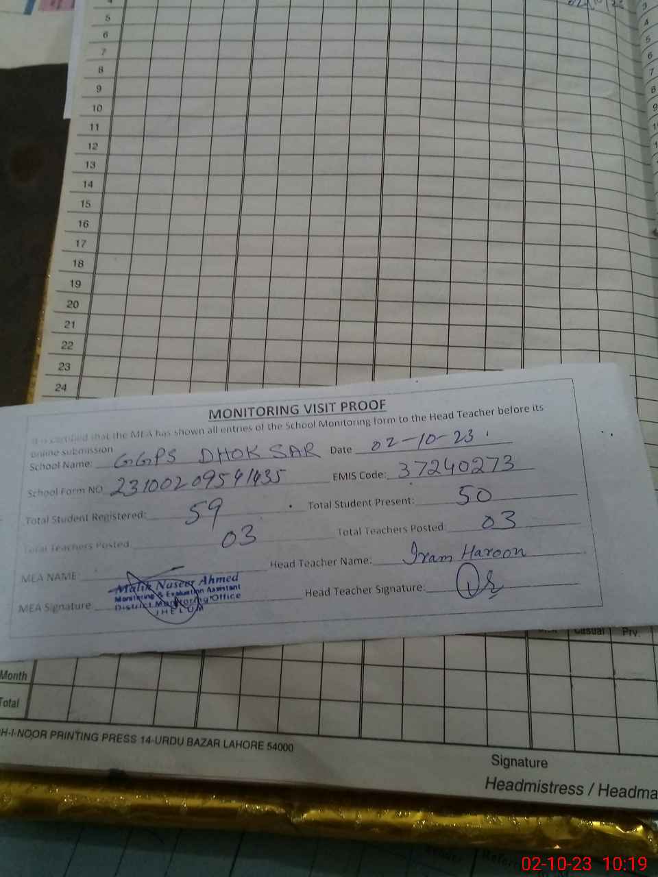 | EMIS Code: 37240273 | Name of School: GGPS DHOK SAR | |||
