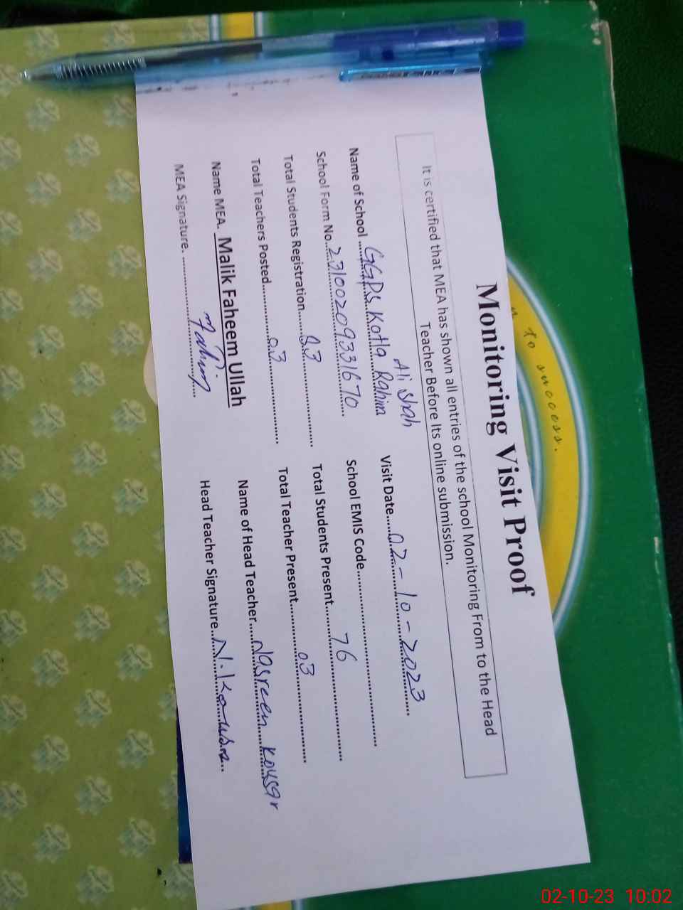 | Attendance Register | Head Teacher | MEA with School | Visit Proof |