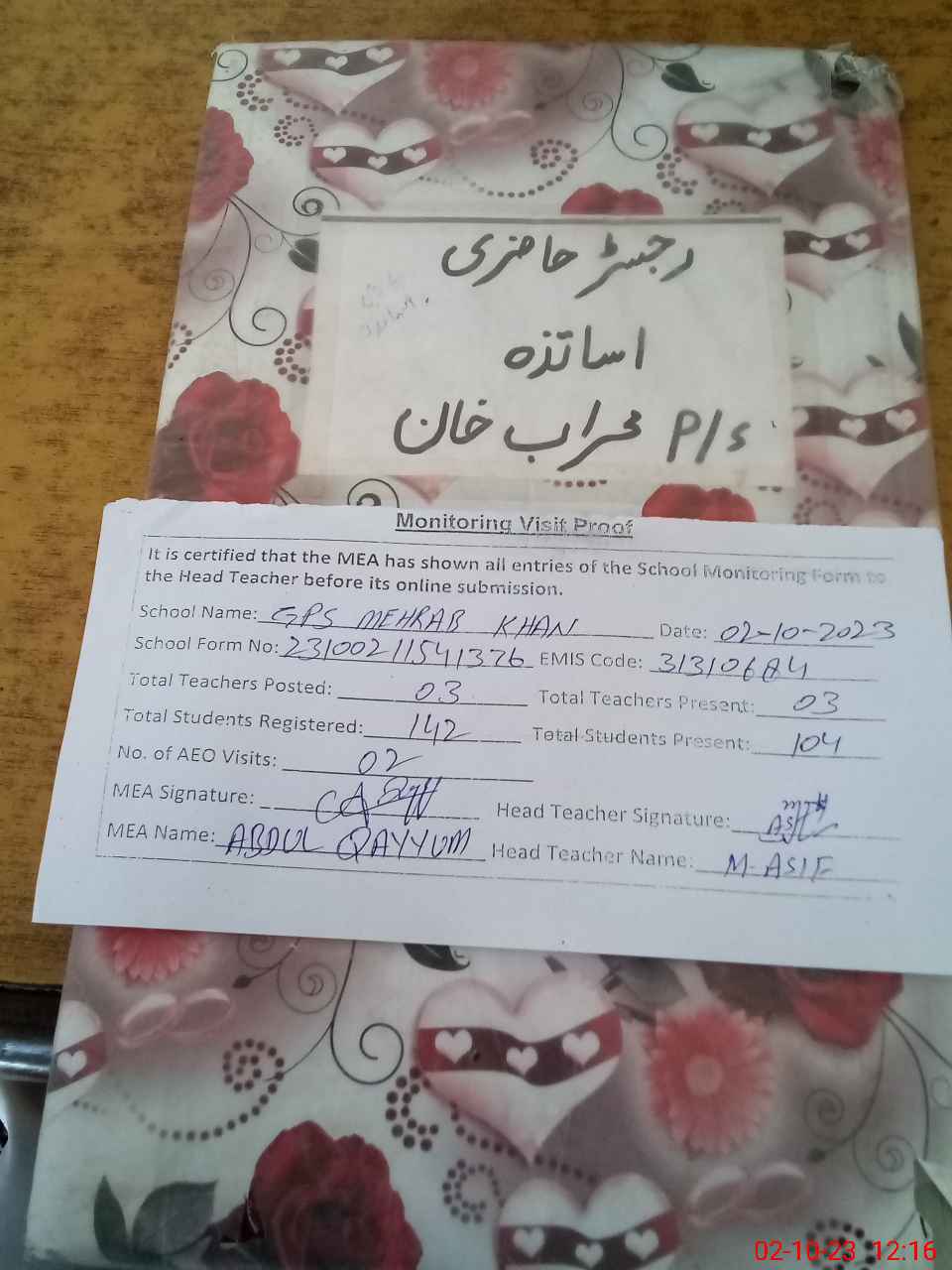 | EMIS Code: 31310684 | Name of School: GPS MEHRAB KHAN | |||