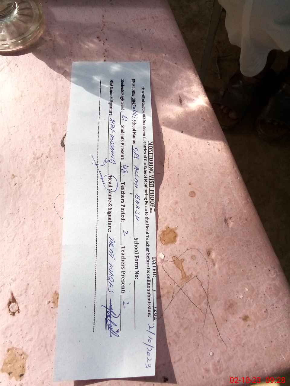 | Monitoring Date: 02-10-2023 | Start Time: 02-10-2023 08:56 AM | End Time: 02-10-2023 09:30 AM | Name of MEA: AL**** HU**** | |