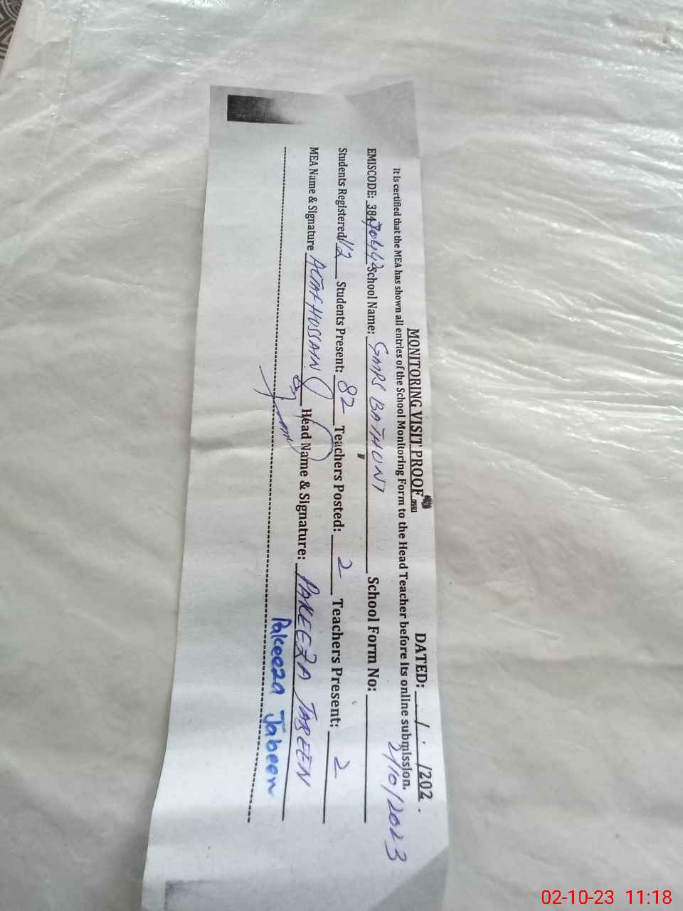 | Attendance Register | Head Teacher | MEA with School | Visit Proof |