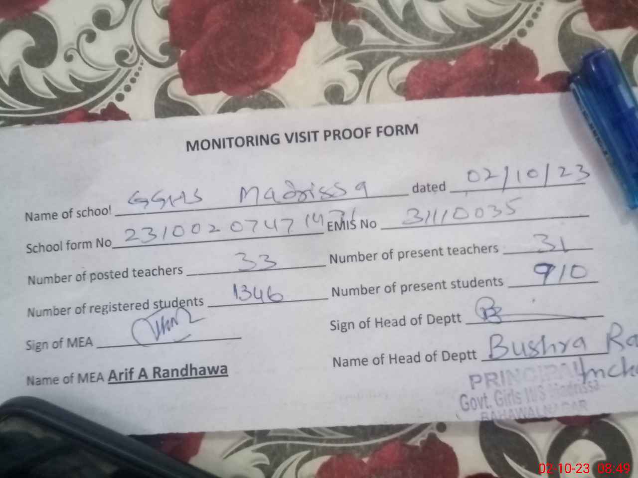| Certified that this School was Inspected by the Undersigned MEA/DMO Today and the Information Stated Above is as Per Record. | |||||