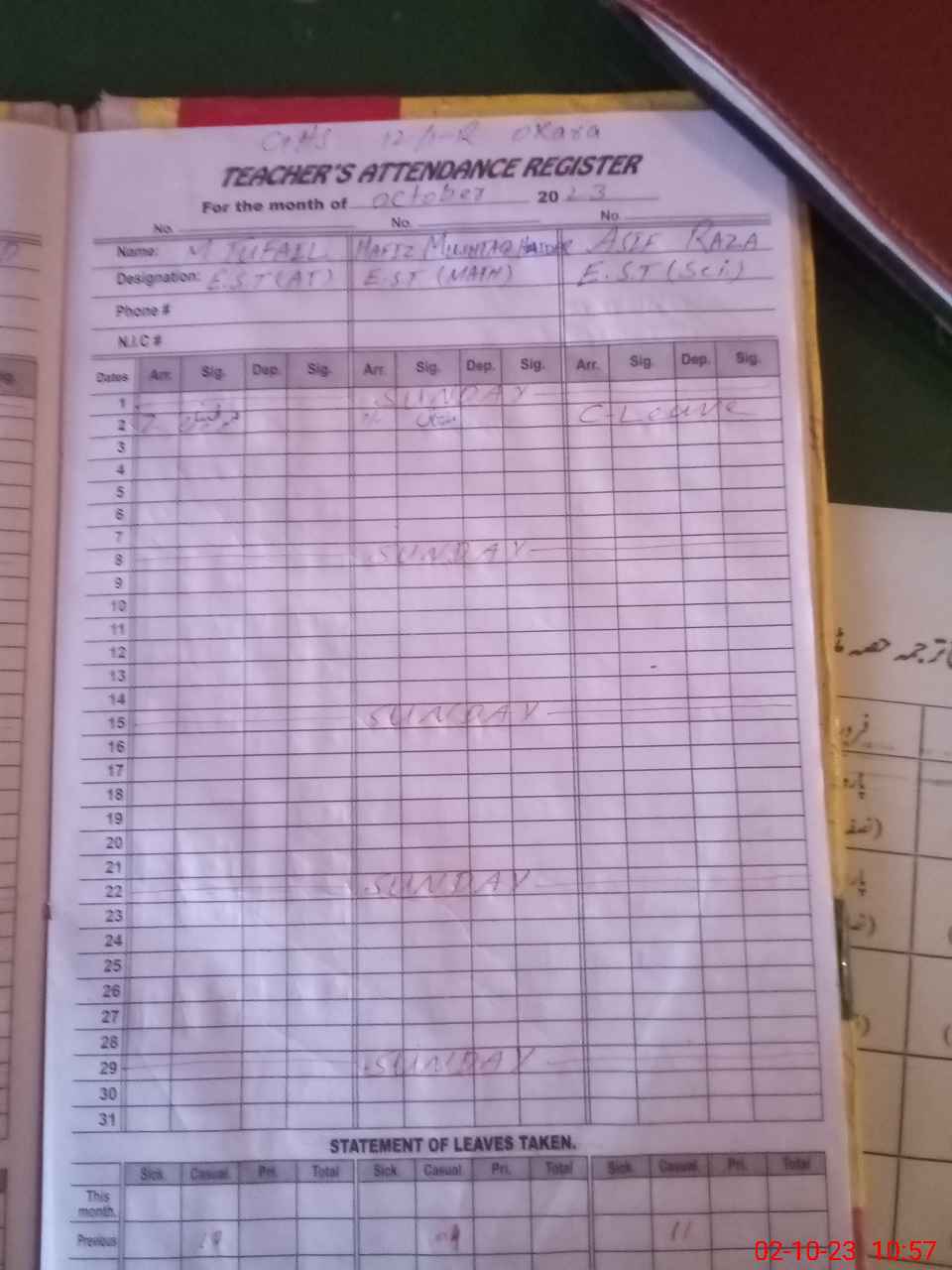 | CNIC | Full Name | Designation | R/C | Absence During Last Calender Month |