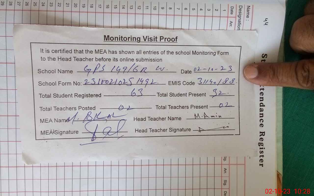 | Attendance Register | Head Teacher | MEA with School | Visit Proof |