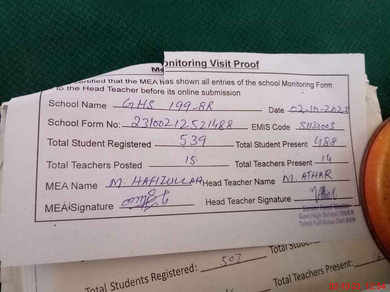| Certified that this School was Inspected by the Undersigned MEA/DMO Today and the Information Stated Above is as Per Record. | |||||