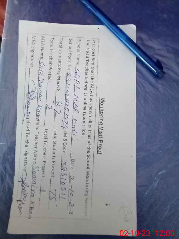 | Attendance Register | Head Teacher | MEA with School | Visit Proof |