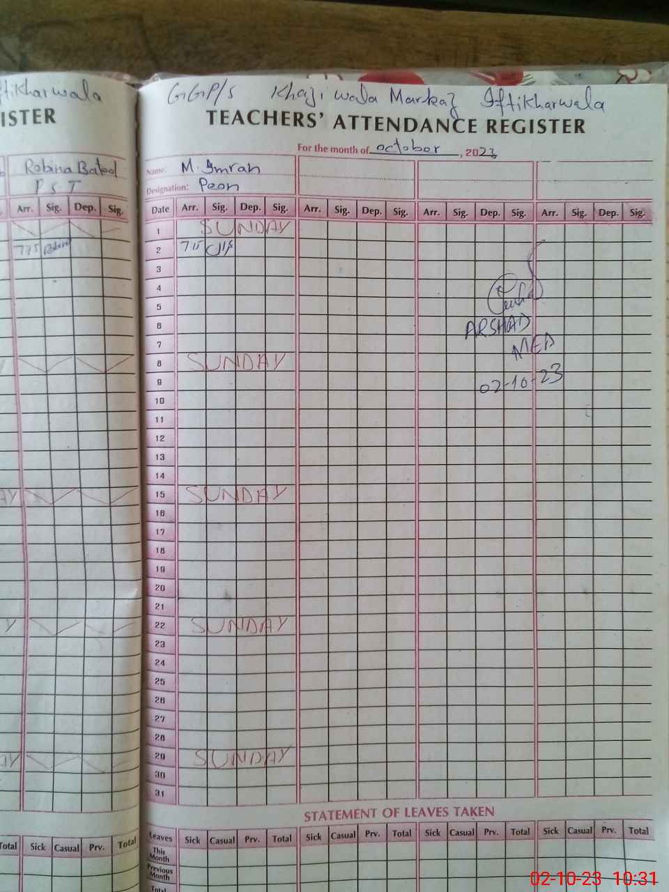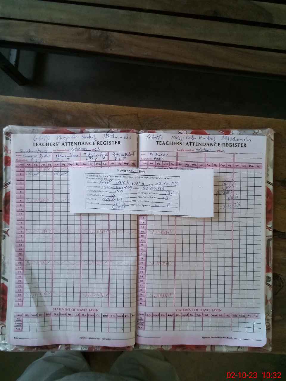 | Attendance Register | Head Teacher | MEA with School | Visit Proof |