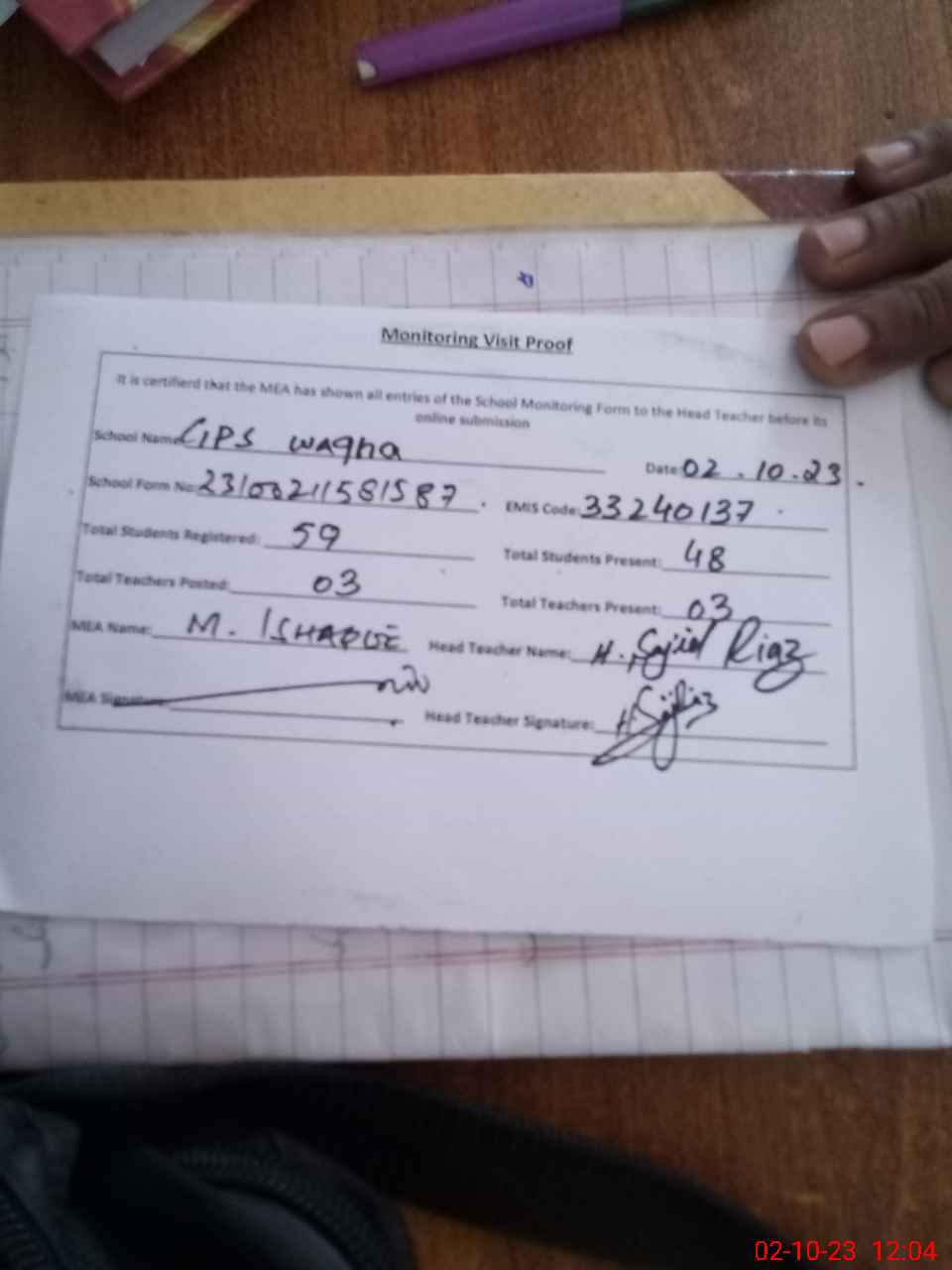 | Attendance Register | Head Teacher | MEA with School | Visit Proof |