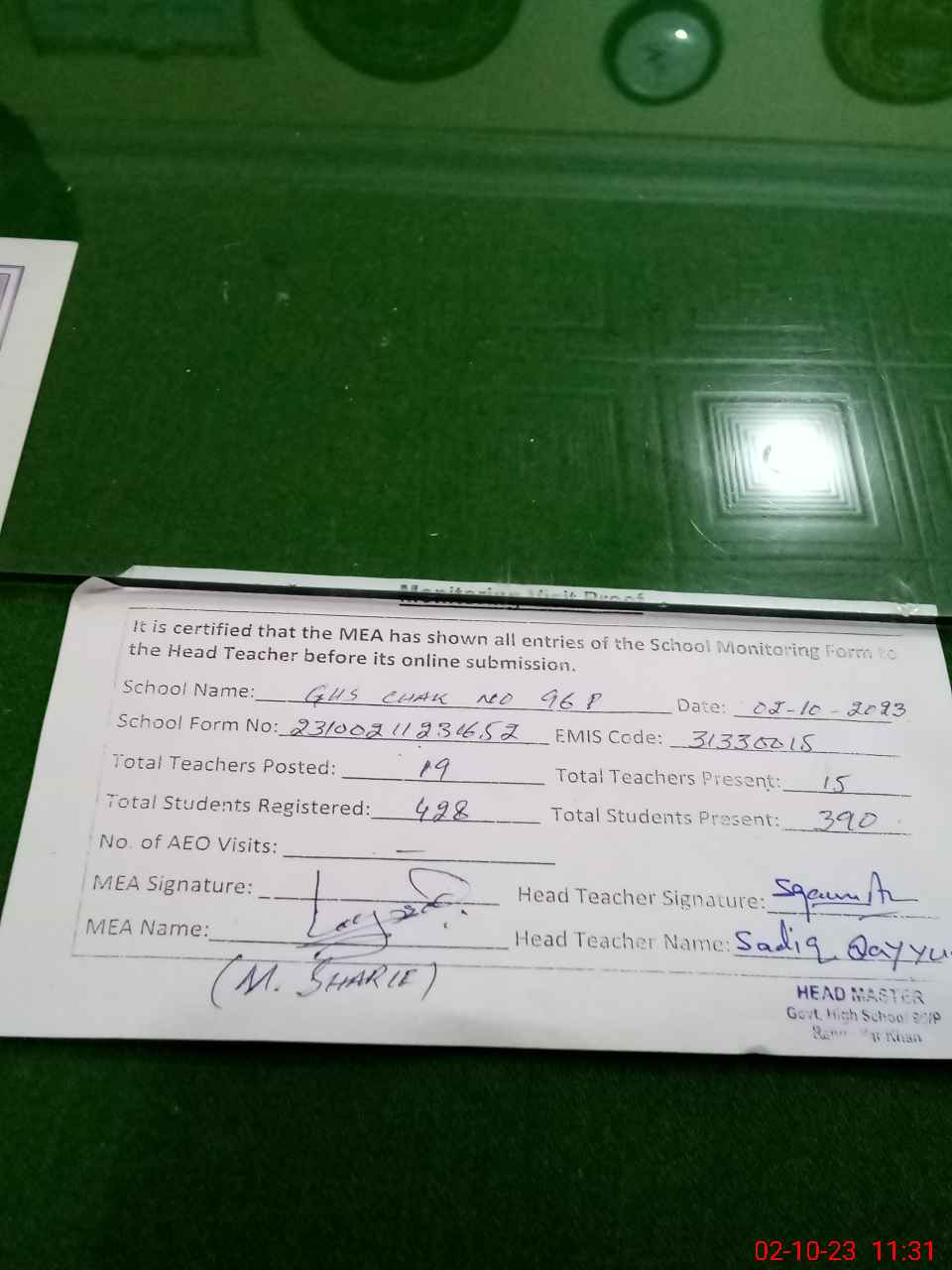 | Certified that this School was Inspected by the Undersigned MEA/DMO Today and the Information Stated Above is as Per Record. | |||||
