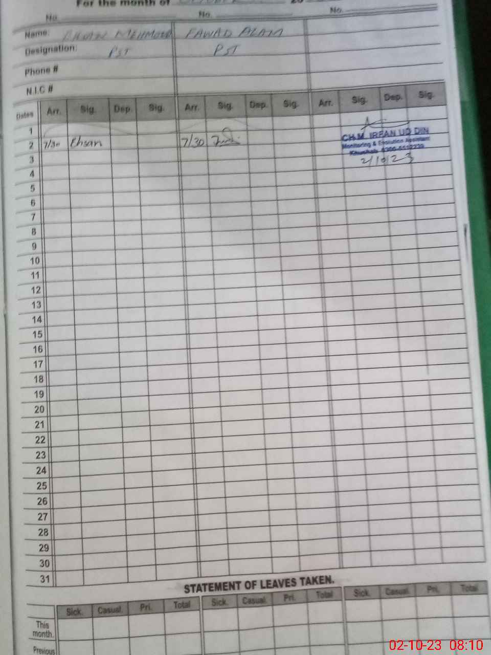 | CNIC | Full Name | Designation | R/C | Absence During Last Calender Month |