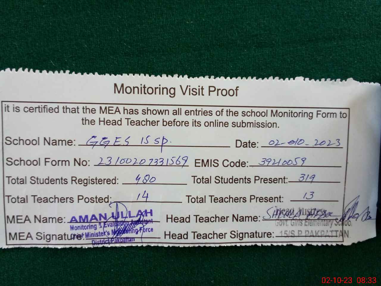 | EMIS Code: 39210059 | Name of School: GGES 15/SP | |||