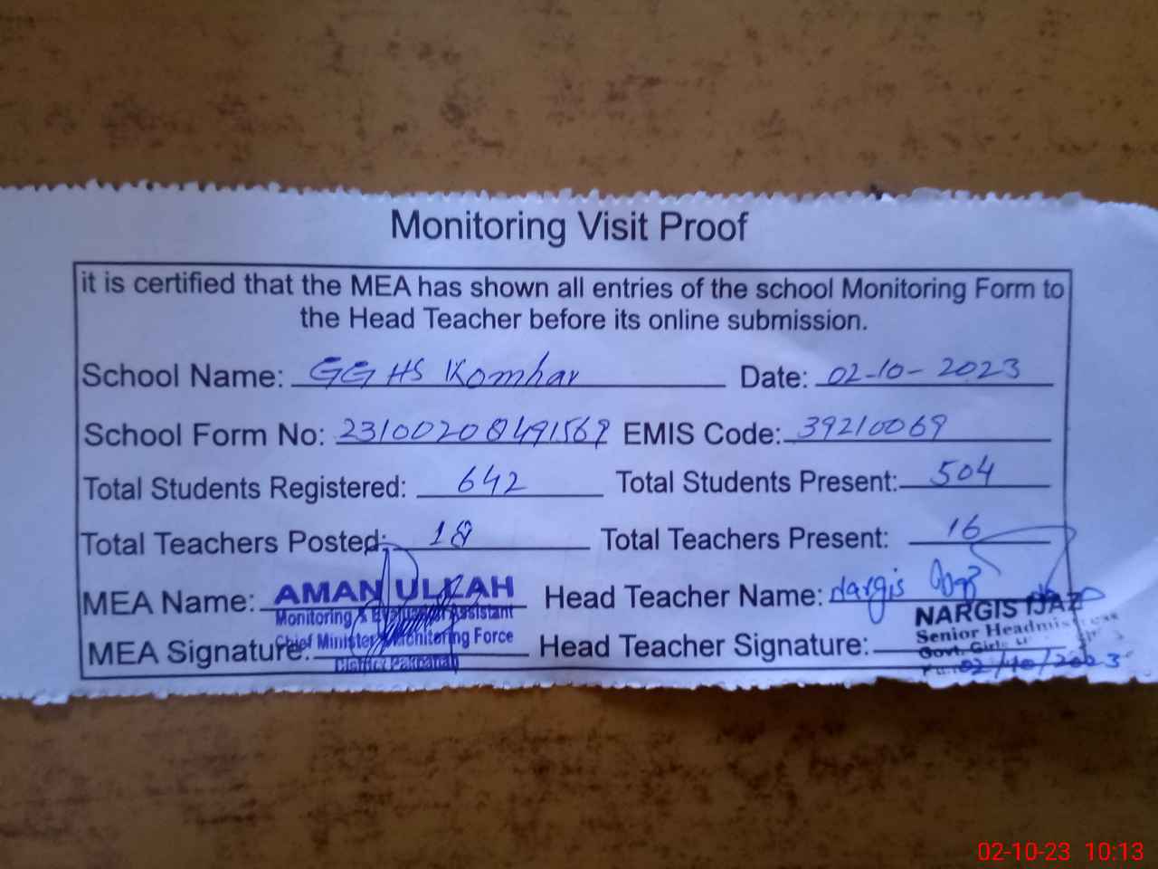 | Attendance Register | Head Teacher | MEA with School | Visit Proof |