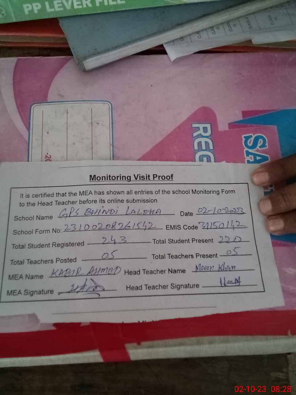 | Certified that this School was Inspected by the Undersigned MEA/DMO Today and the Information Stated Above is as Per Record. | |||||