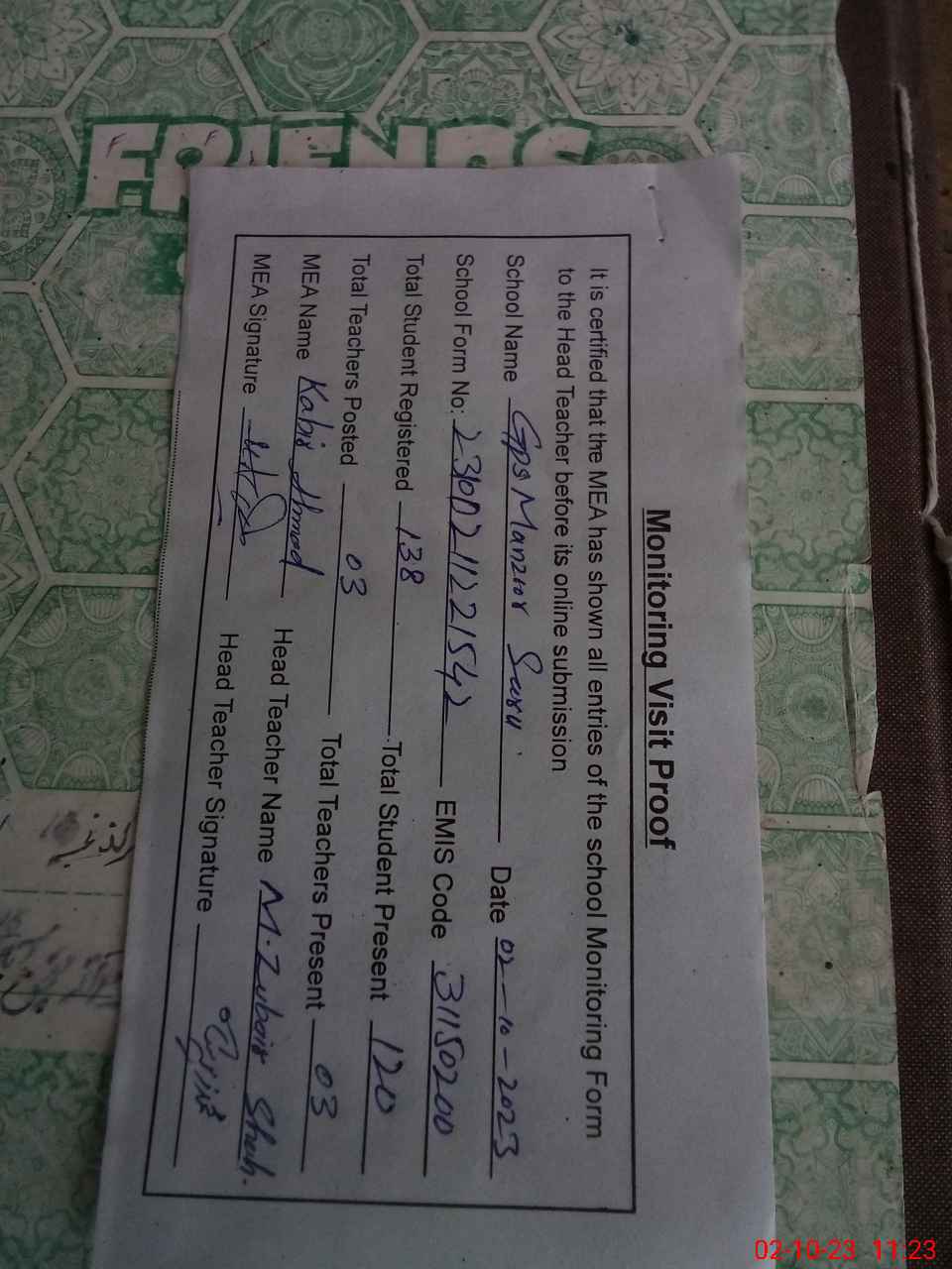 | EMIS Code: 31150200 | Name of School: GPS MANZOOR SARU | |||