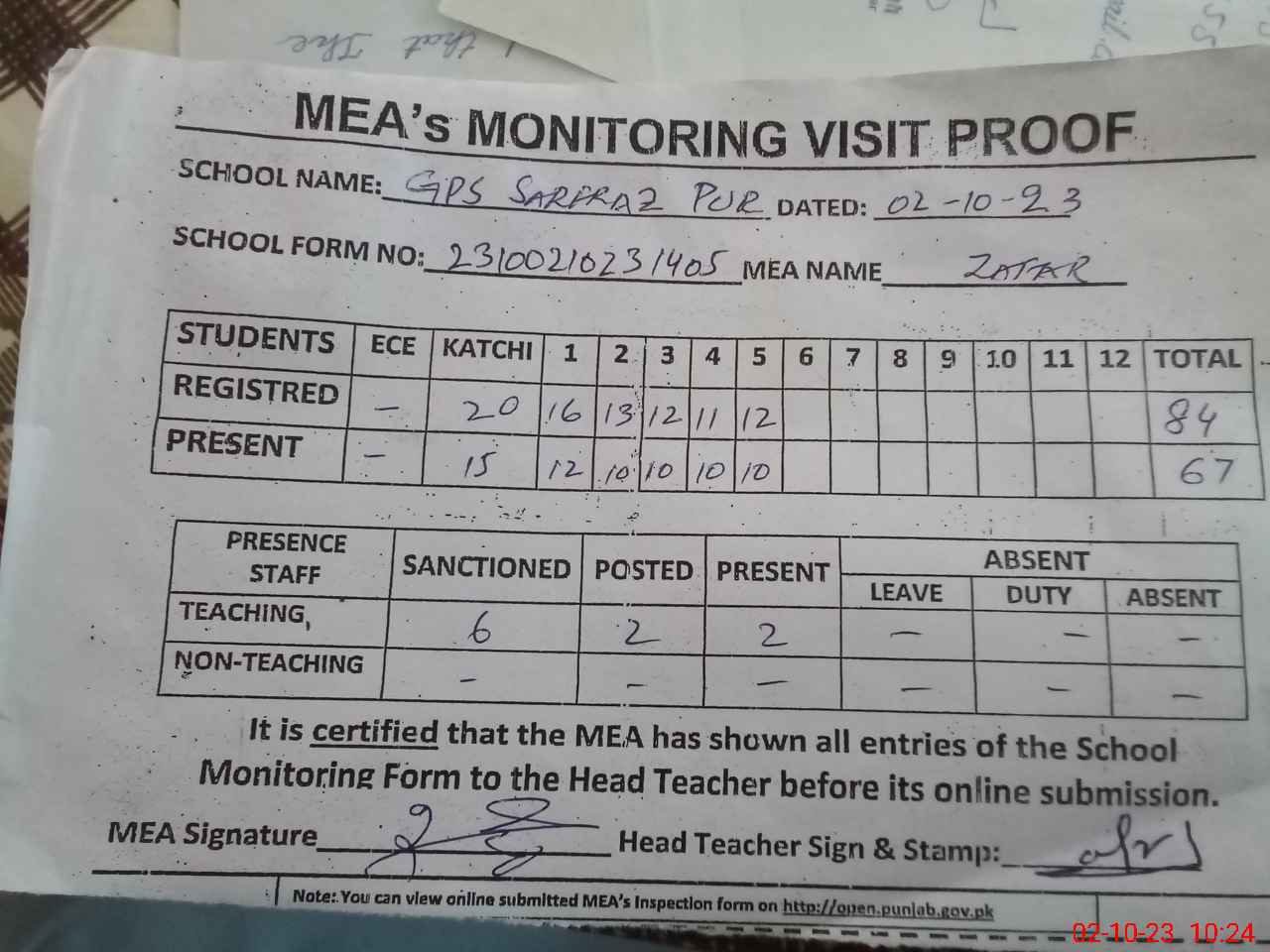 | EMIS Code: 36410309 | Name of School: GPS SARFRAZ PUR, P/O HAJI PUR, NAWAN SHEHR | |||