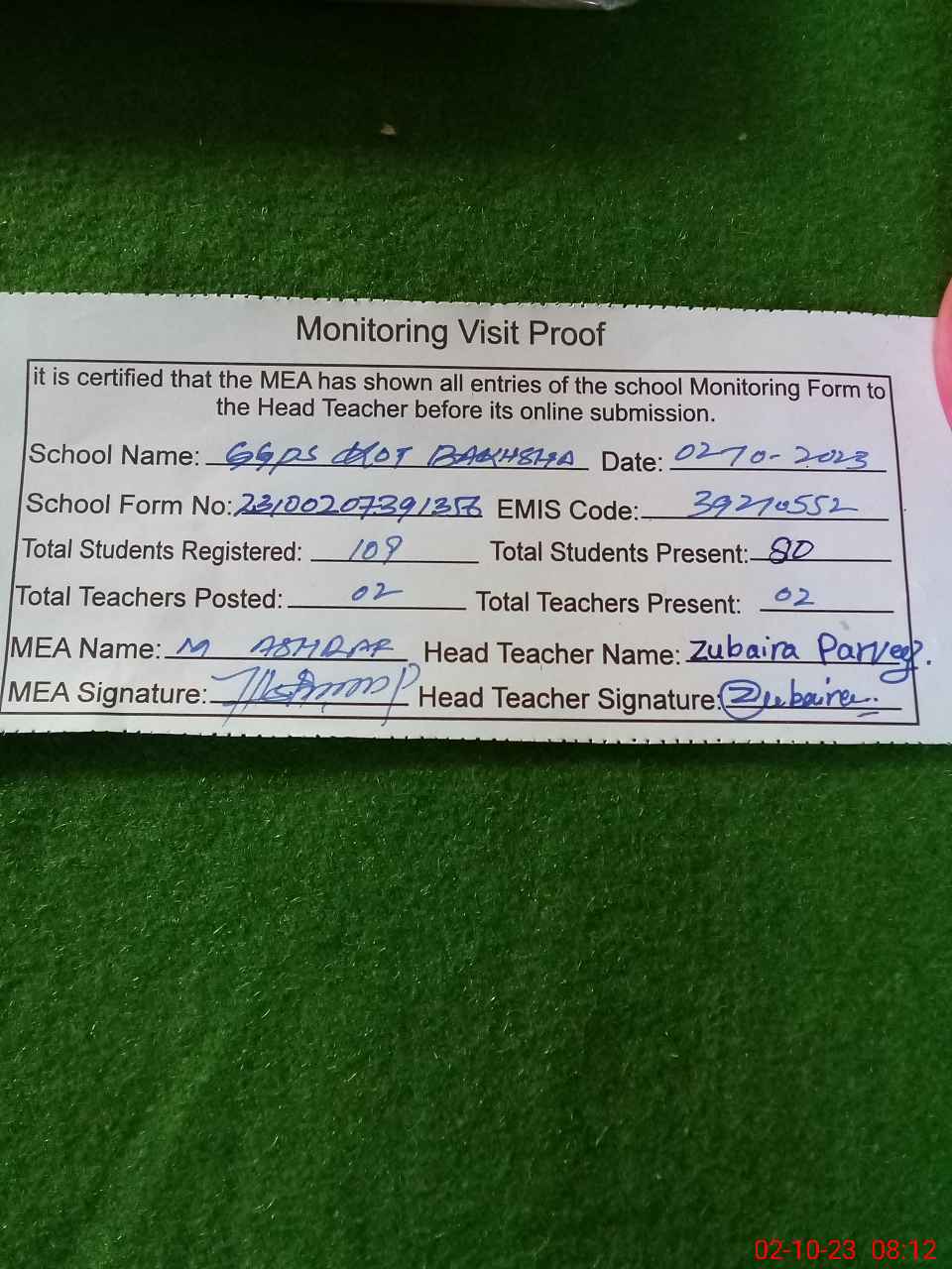 | Attendance Register | Head Teacher | MEA with School | Visit Proof |