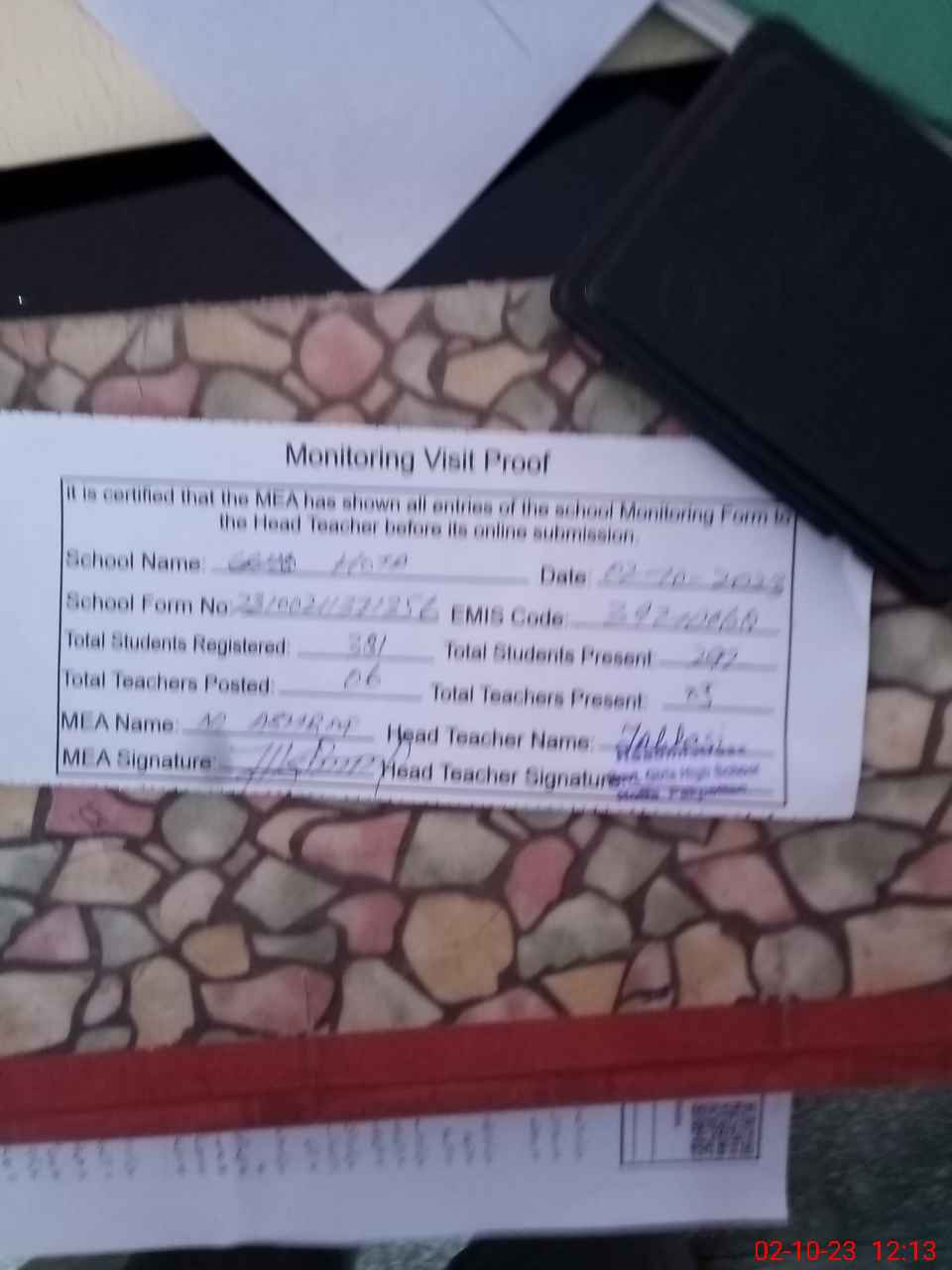 | Attendance Register | Head Teacher | MEA with School | Visit Proof |