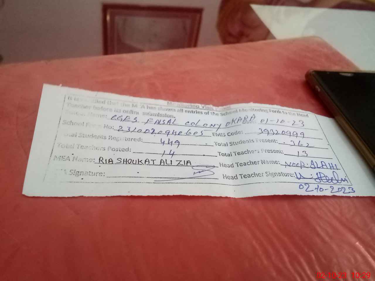| EMIS Code: 39320999 | Name of School: GGES FAISAL COLONY OKARA | |||