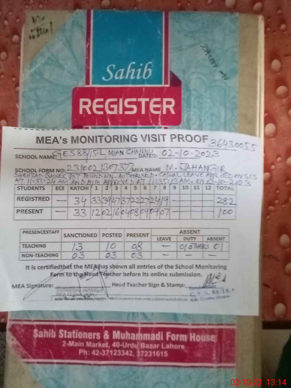 | Attendance Register | Head Teacher | MEA with School | Visit Proof |
