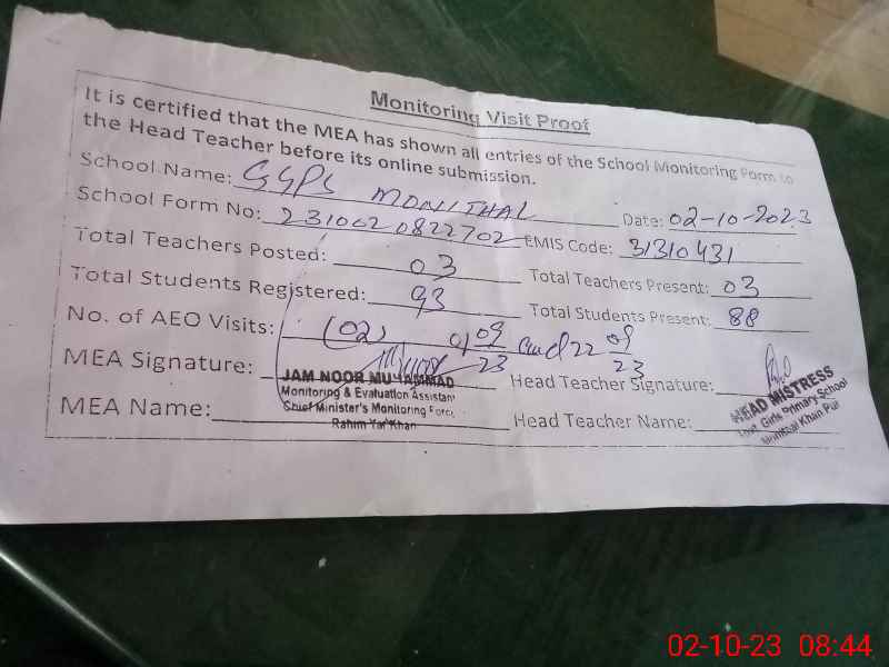 | Certified that this School was Inspected by the Undersigned MEA/DMO Today and the Information Stated Above is as Per Record. | |||||