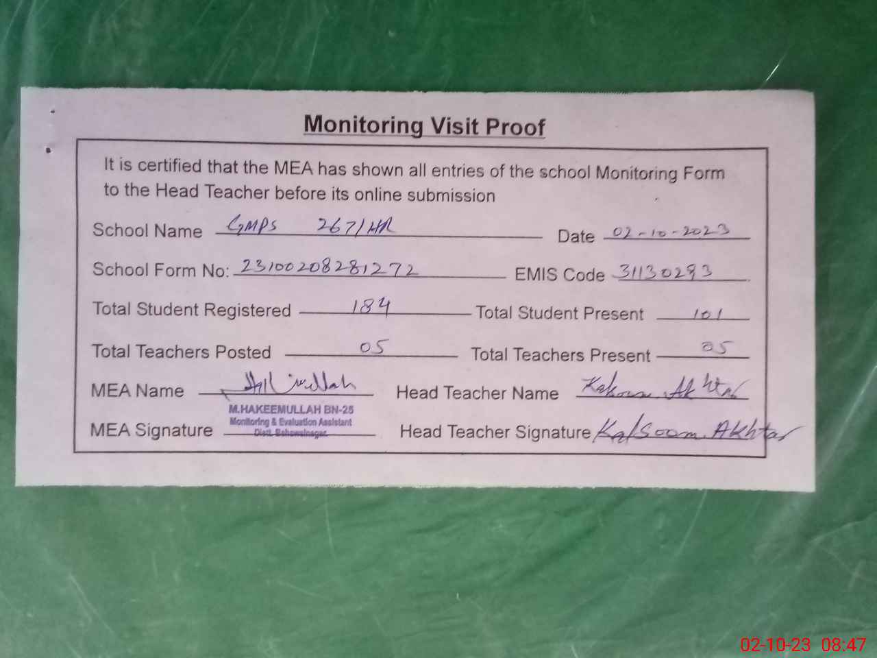 | EMIS Code: 31130293 | Name of School: GMPS CHAK NO 267 HR | |||
