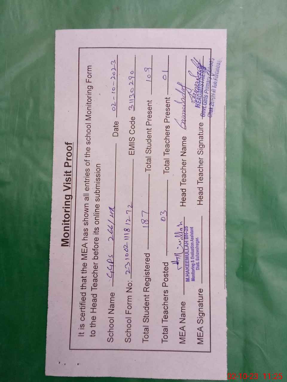 | Attendance Register | Head Teacher | MEA with School | Visit Proof |