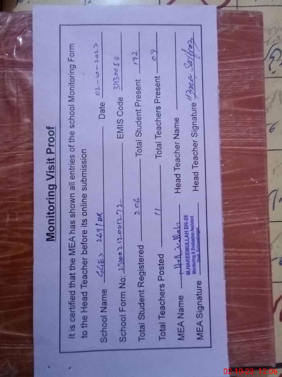 | Attendance Register | Head Teacher | MEA with School | Visit Proof |