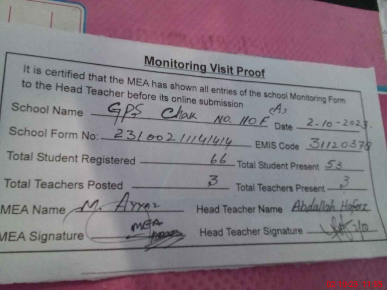 | Attendance Register | Head Teacher | MEA with School | Visit Proof |