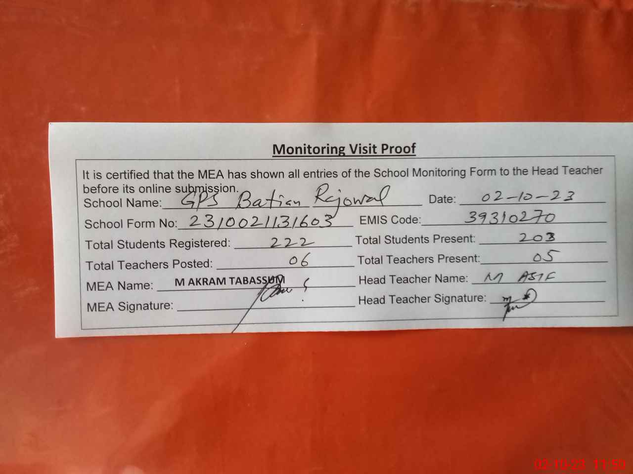 | Attendance Register | Head Teacher | MEA with School | Visit Proof |