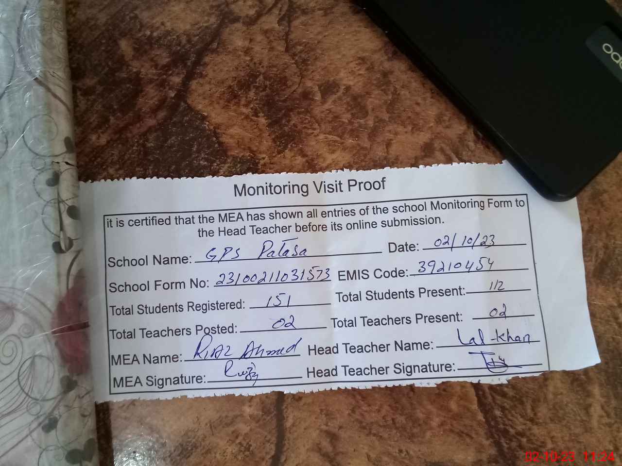 | Attendance Register | Head Teacher | MEA with School | Visit Proof |