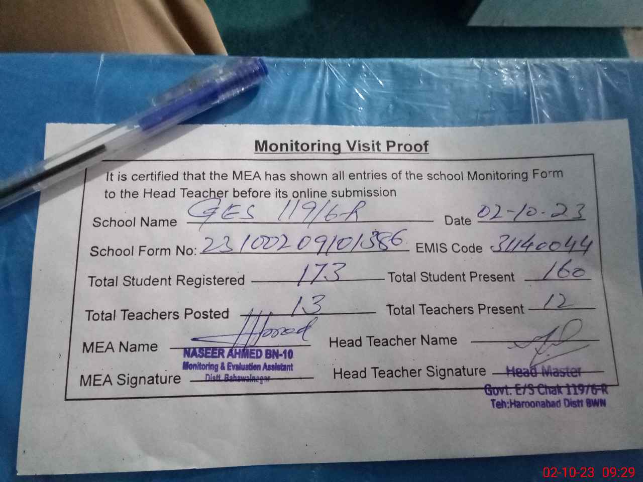| Attendance Register | Head Teacher | MEA with School | Visit Proof |