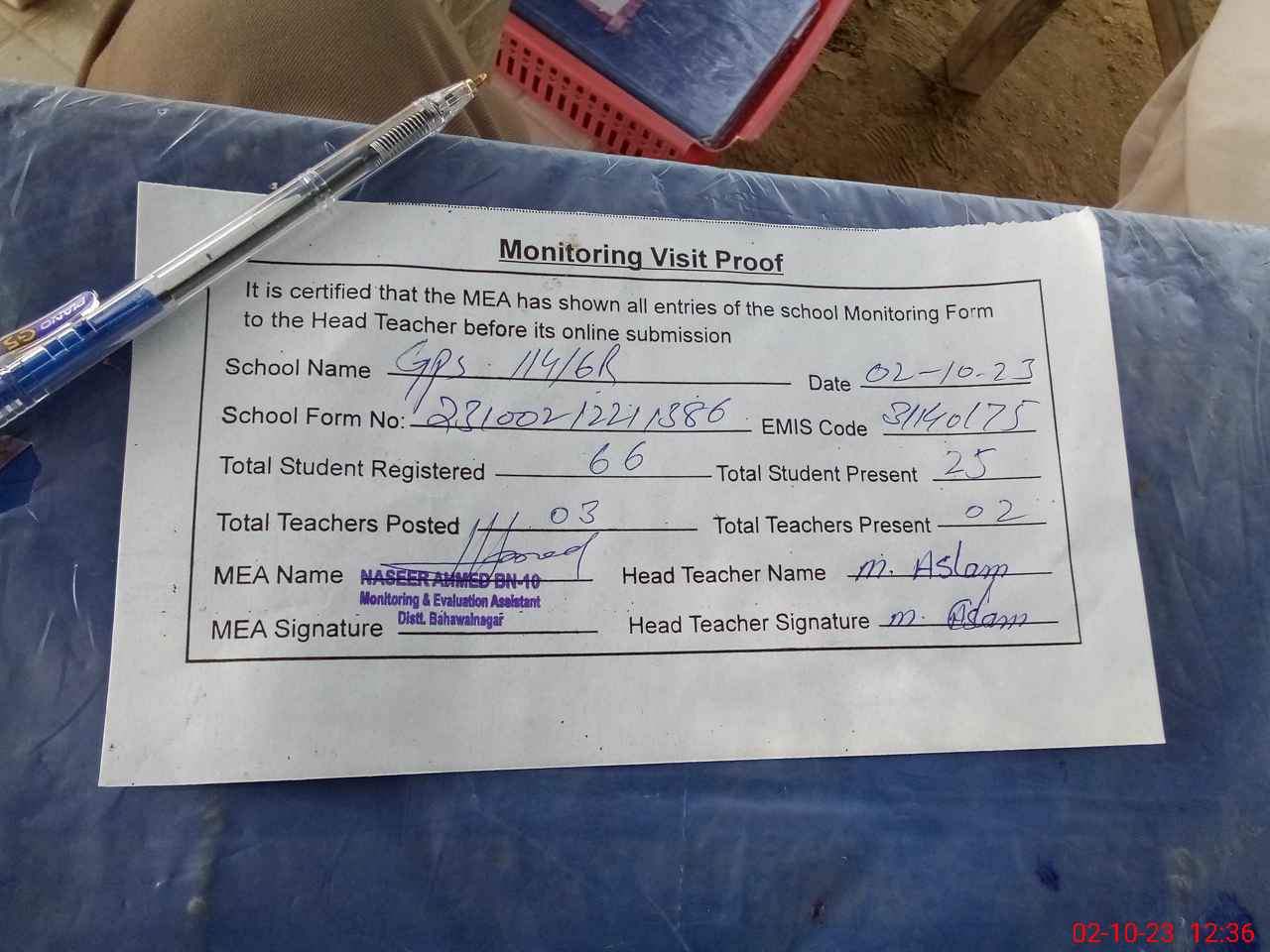| Attendance Register | Head Teacher | MEA with School | Visit Proof |