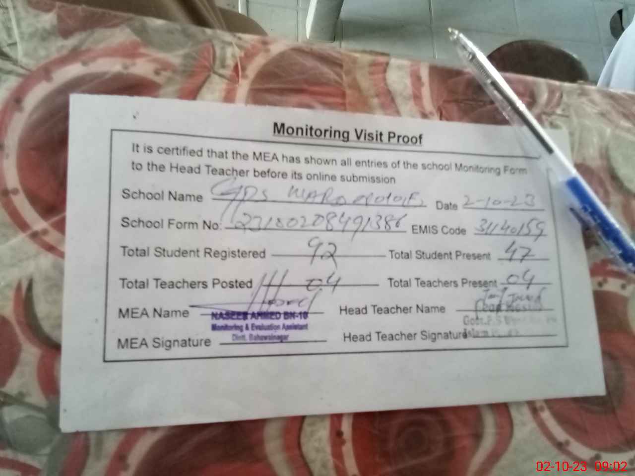 | Attendance Register | Head Teacher | MEA with School | Visit Proof |