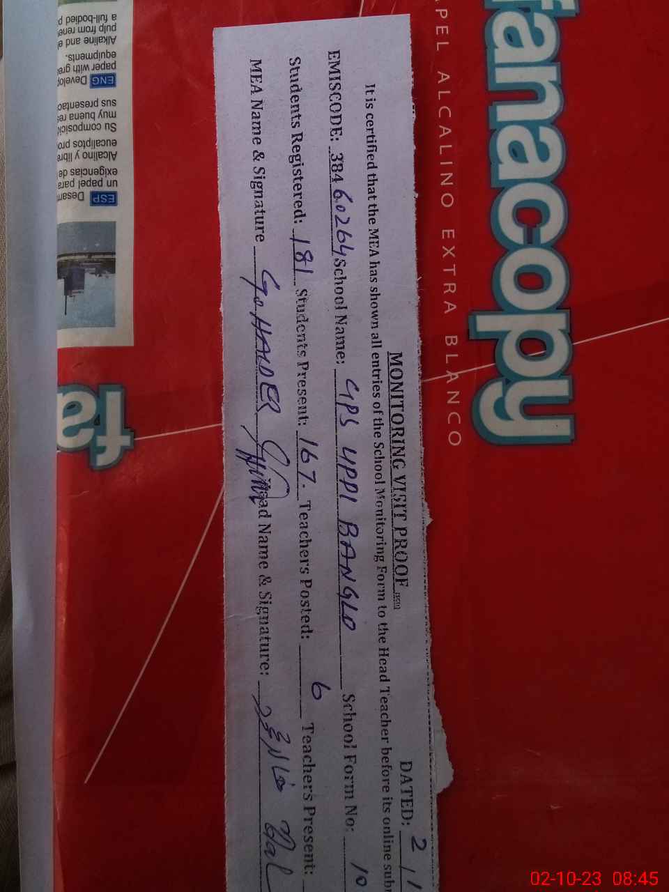 | Certified that this School was Inspected by the Undersigned MEA/DMO Today and the Information Stated Above is as Per Record. | |||||