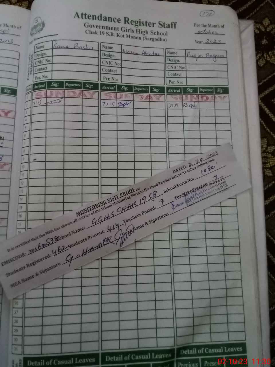 | Name: SA**** BA**** Designation: (School Headmaster's/Headmistress's) SST SCIENCE (HEADMISTRESS) Phone/Cell Number: 03**** |