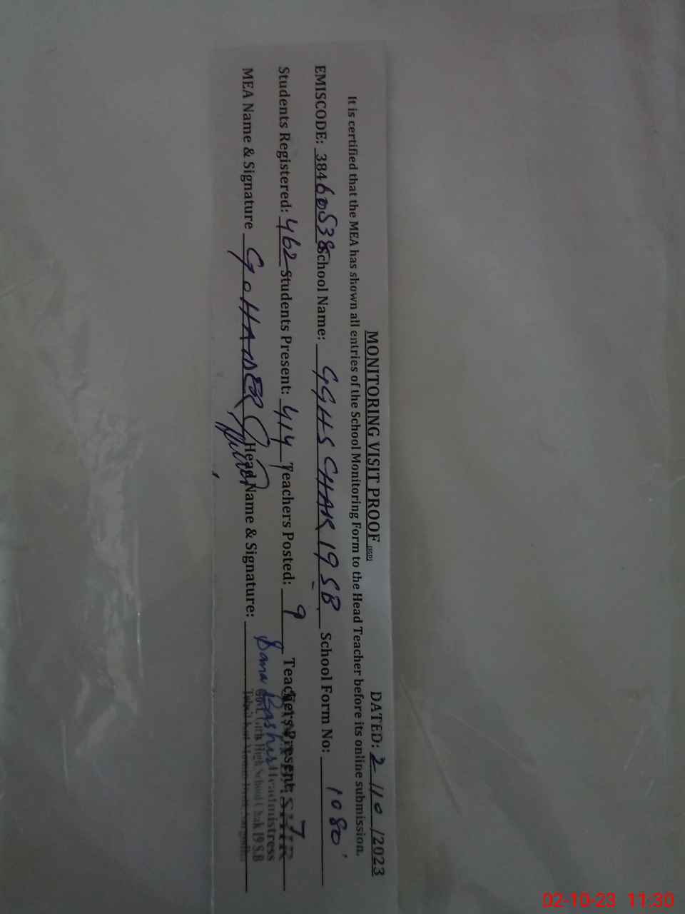 | Certified that this School was Inspected by the Undersigned MEA/DMO Today and the Information Stated Above is as Per Record. | |||||