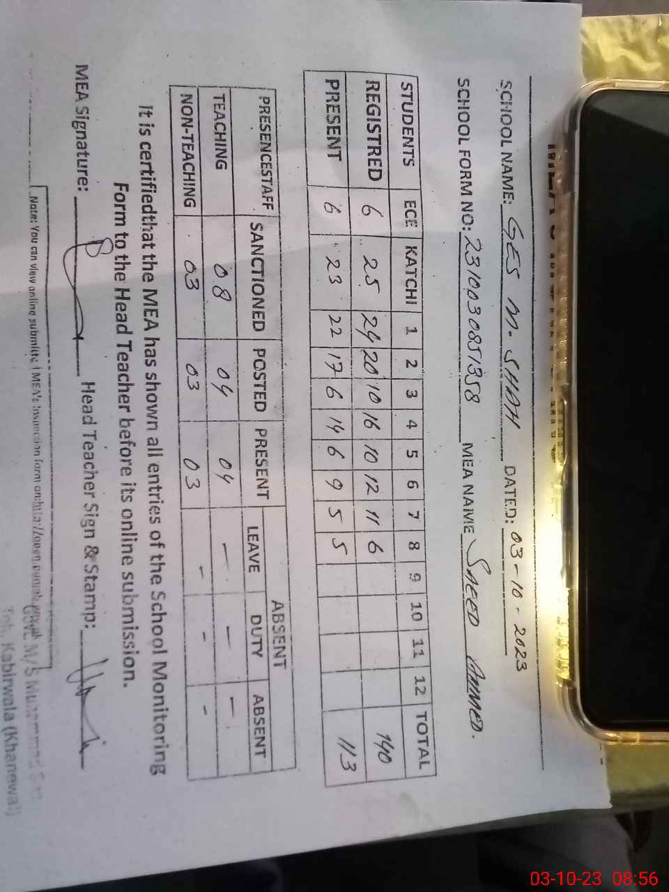 | Attendance Register | Head Teacher | MEA with School | Visit Proof |