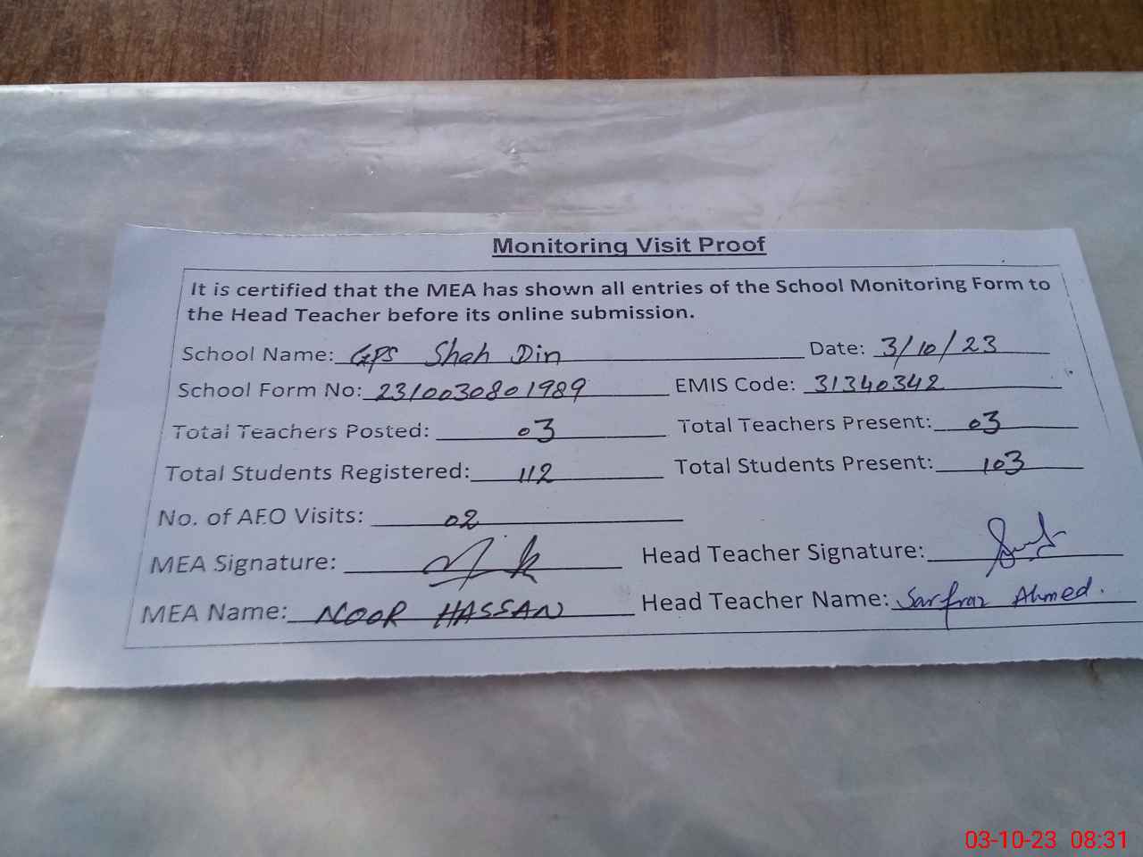 | Attendance Register | Head Teacher | MEA with School | Visit Proof |