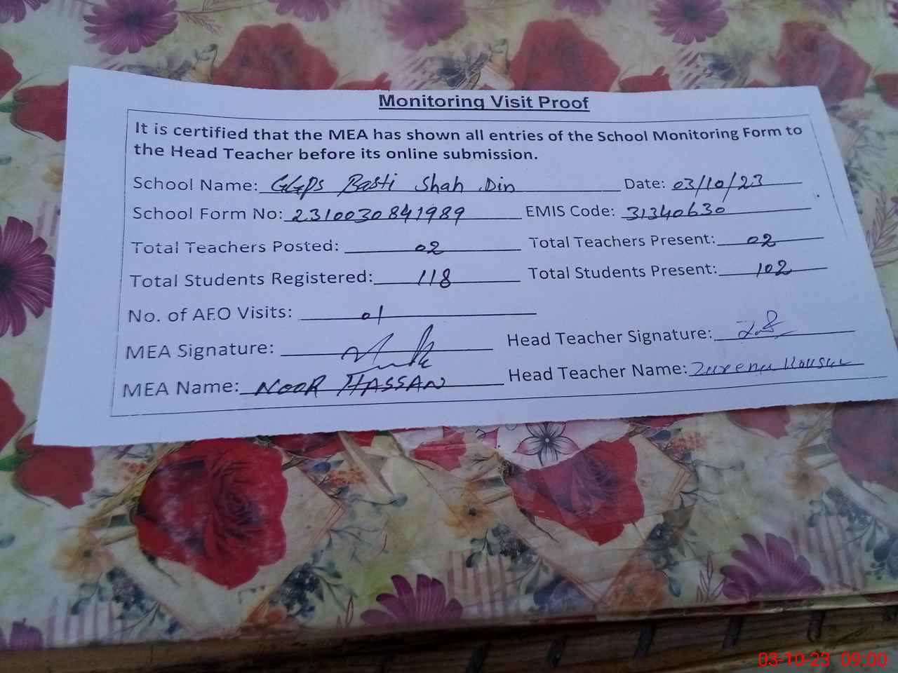 | Attendance Register | Head Teacher | MEA with School | Visit Proof |