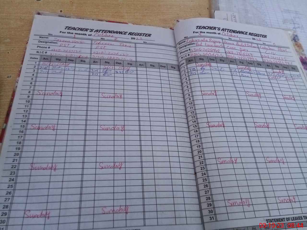 | CNIC | Full Name | Designation | R/C | Absence During Last Calender Month |