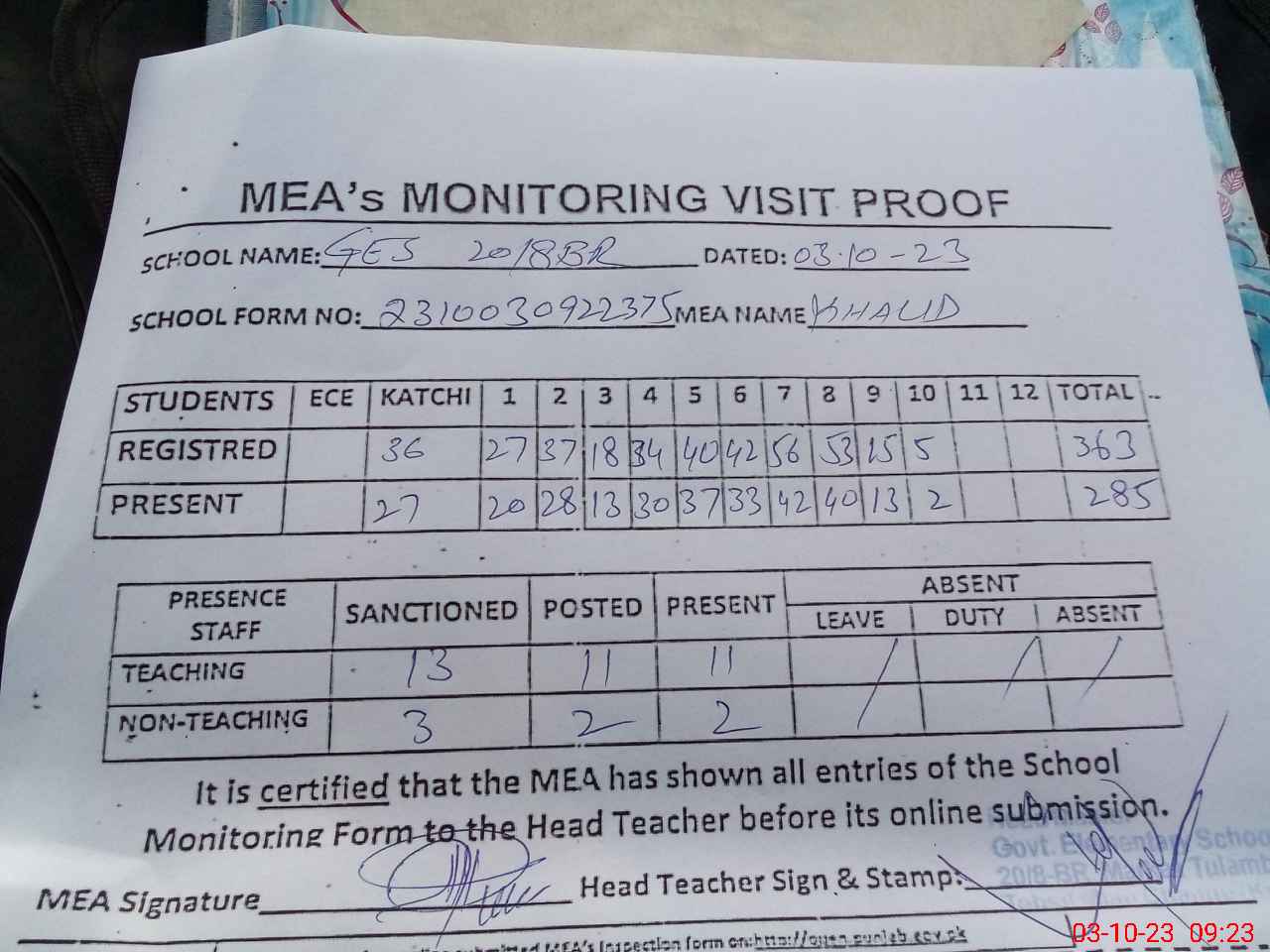 | Attendance Register | Head Teacher | MEA with School | Visit Proof |