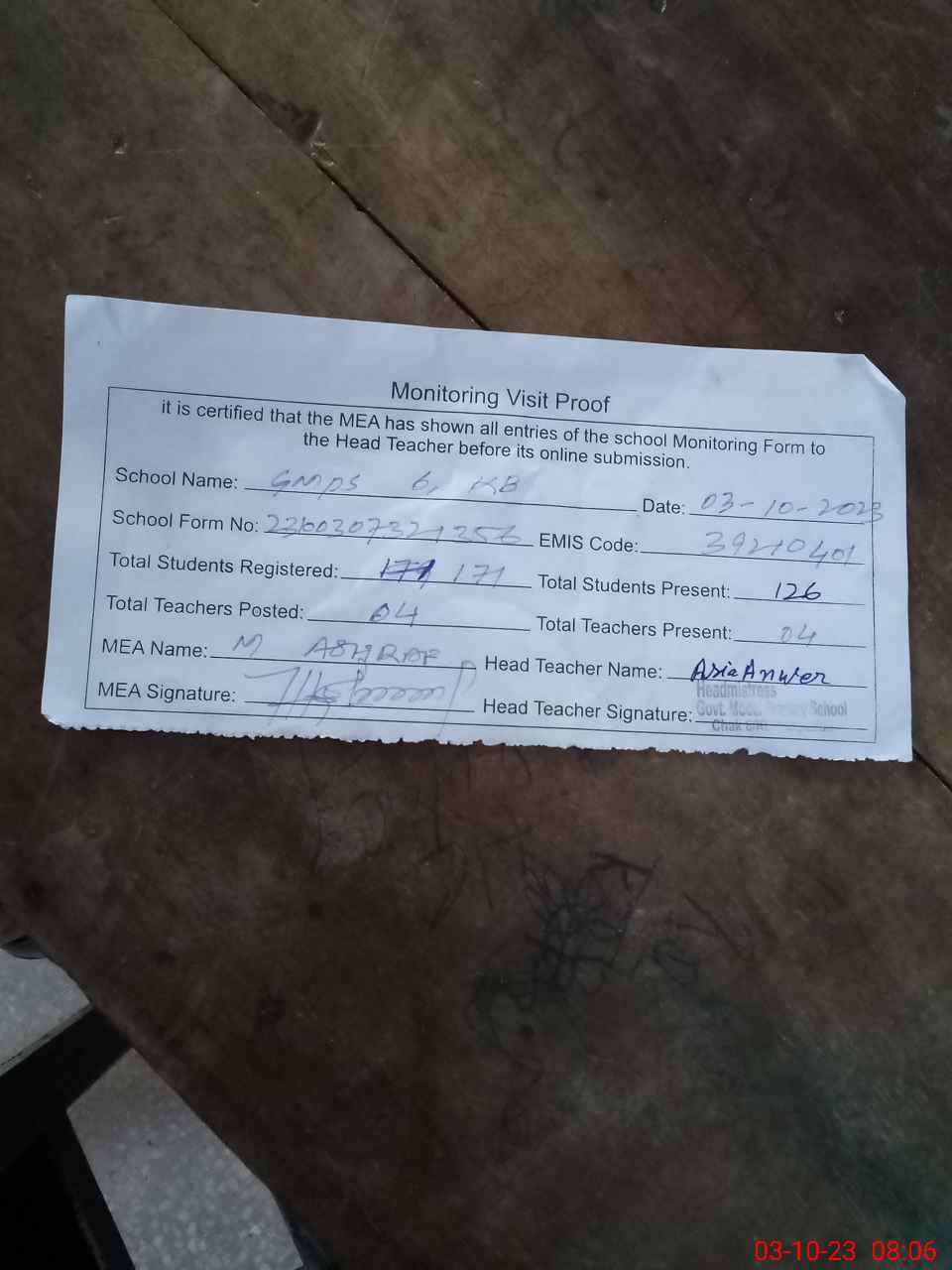 | Attendance Register | Head Teacher | MEA with School | Visit Proof |