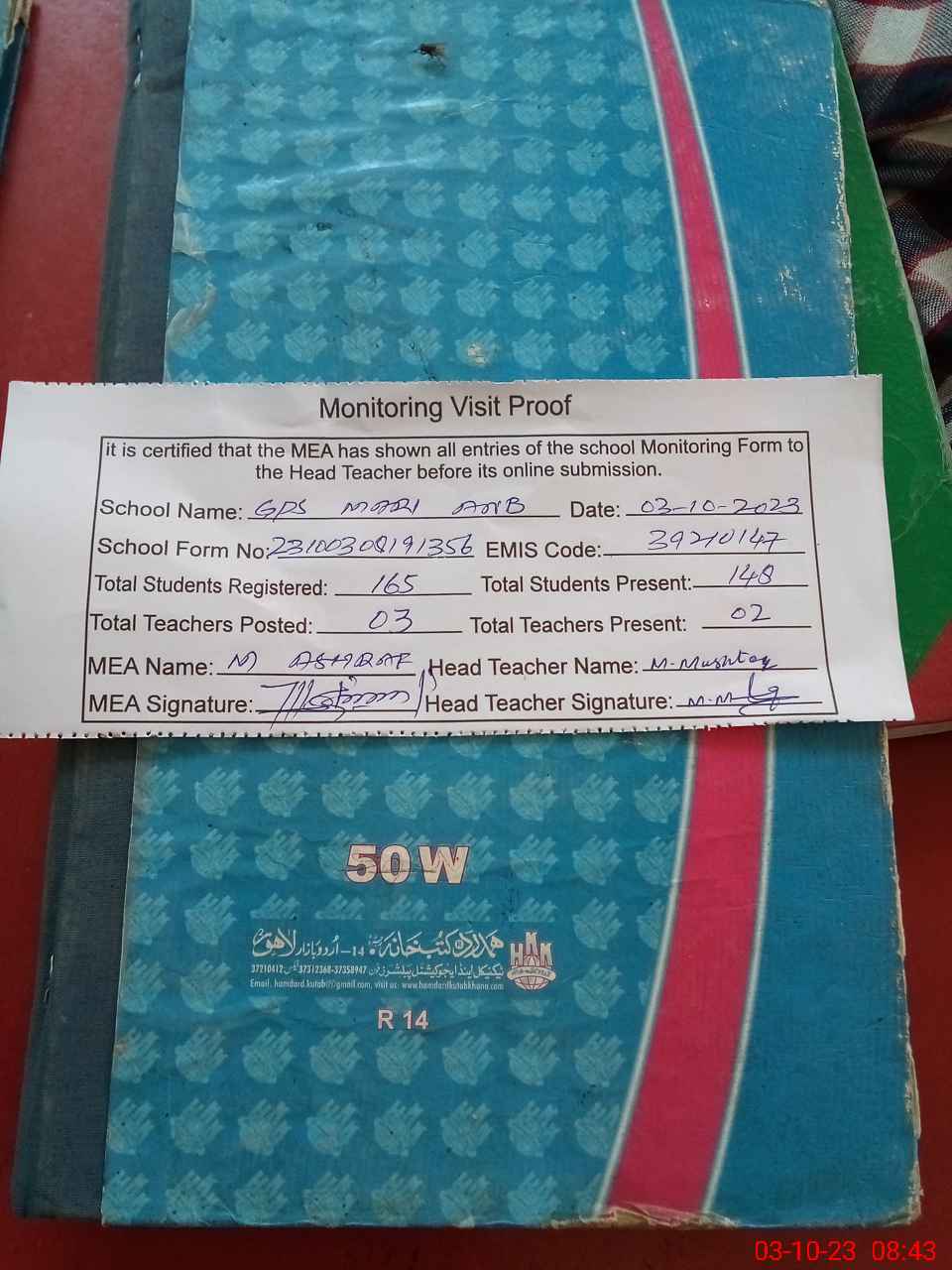 | Attendance Register | Head Teacher | MEA with School | Visit Proof |