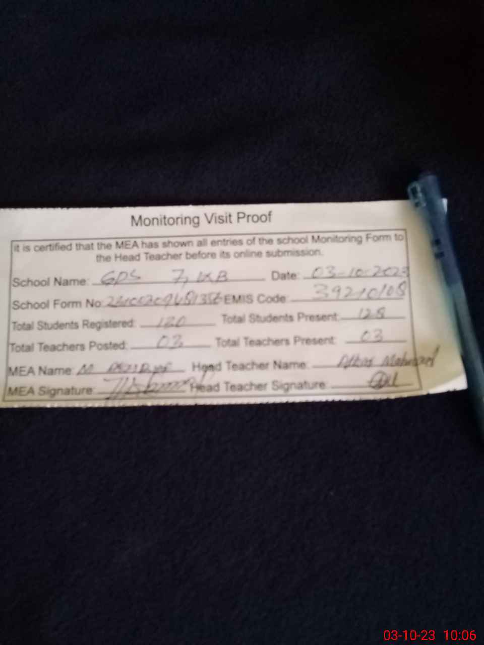 | Name: AT**** MA**** Designation: (School Headmaster's/Headmistress's) PST Phone/Cell Number: 03**** |