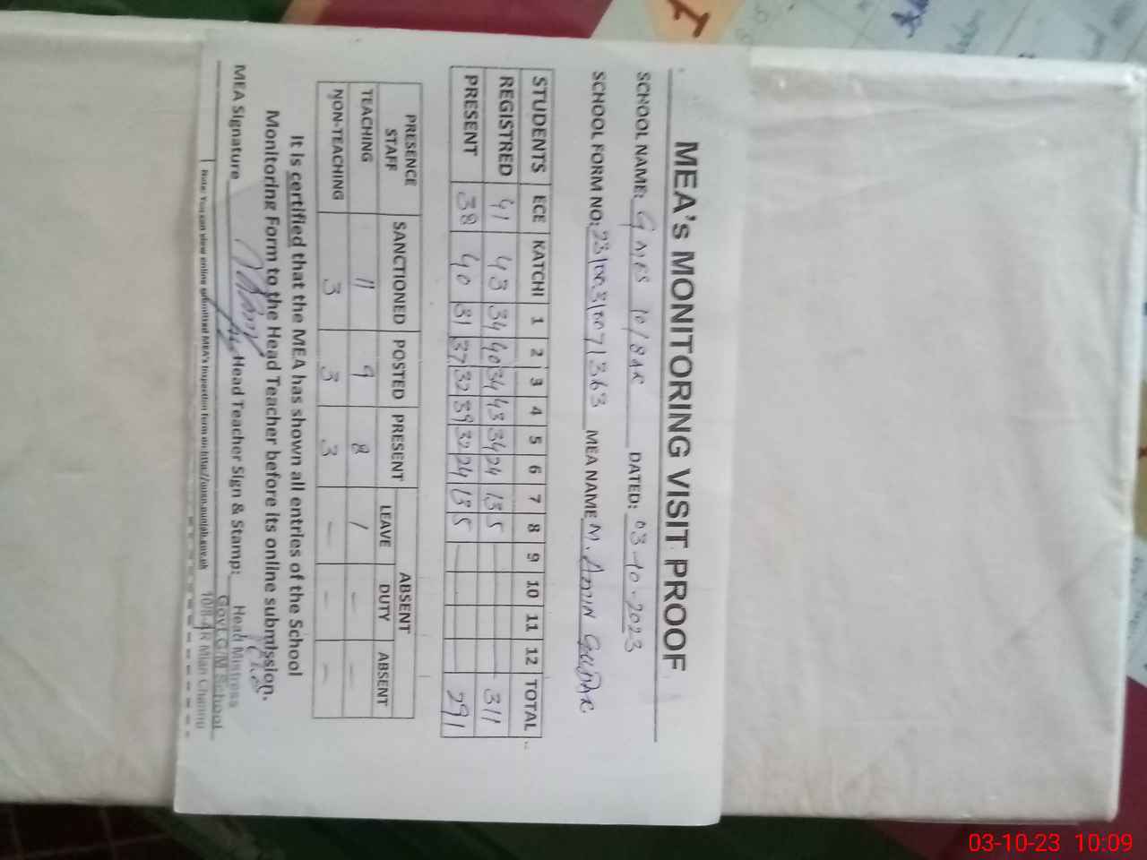 | Attendance Register | Head Teacher | MEA with School | Visit Proof |