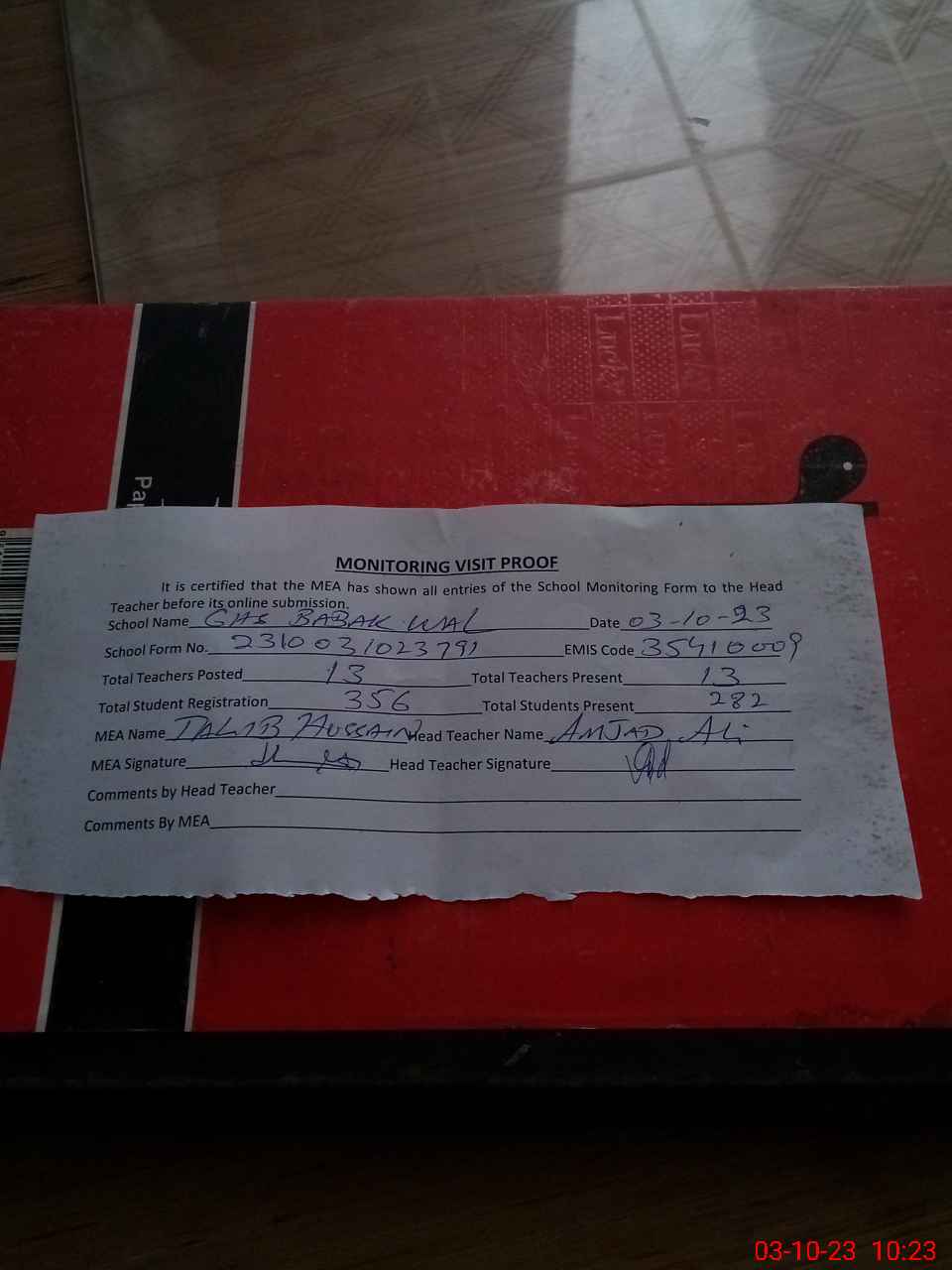 | Attendance Register | Head Teacher | MEA with School | Visit Proof |