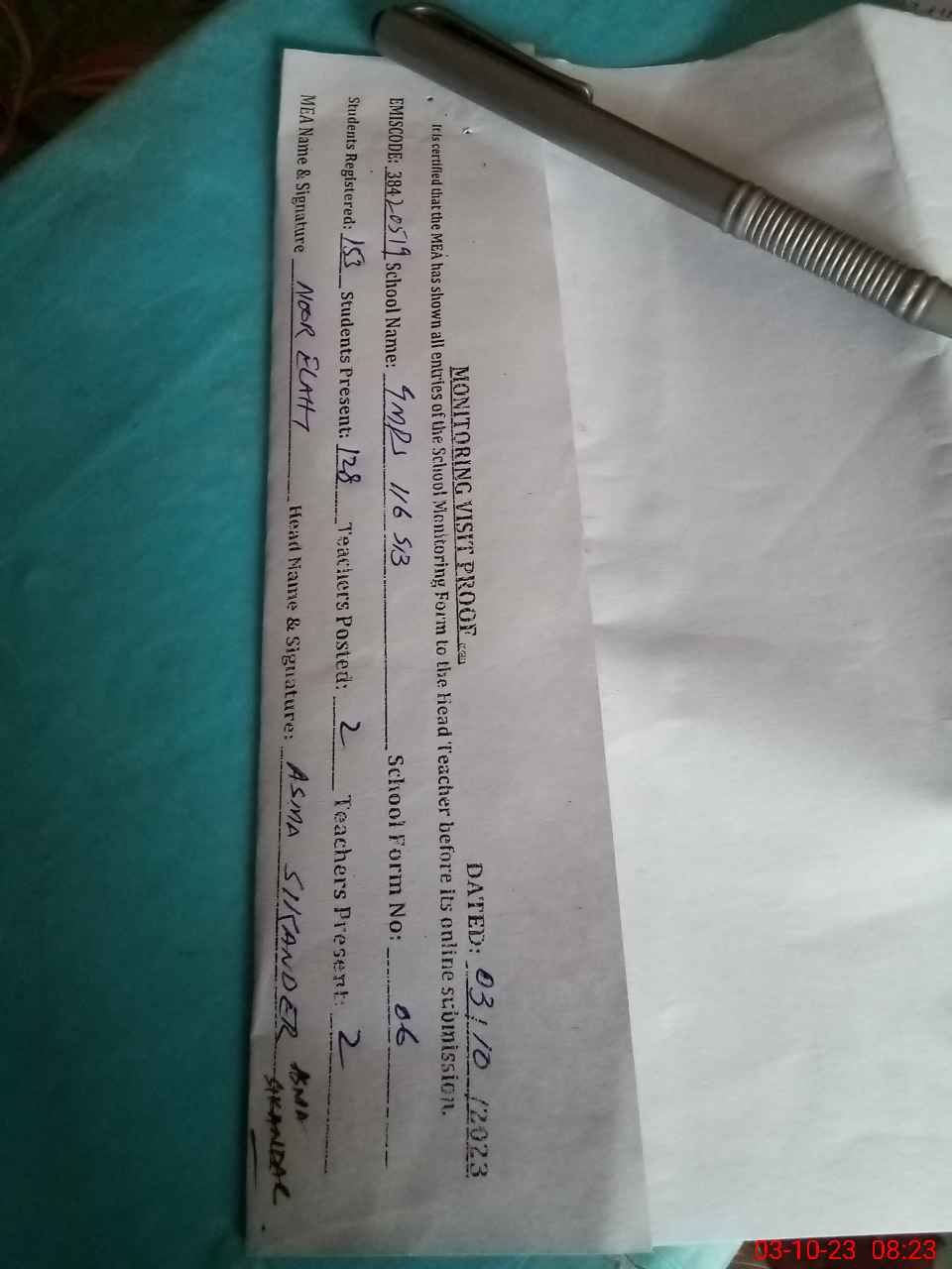 | Attendance Register | Head Teacher | MEA with School | Visit Proof |