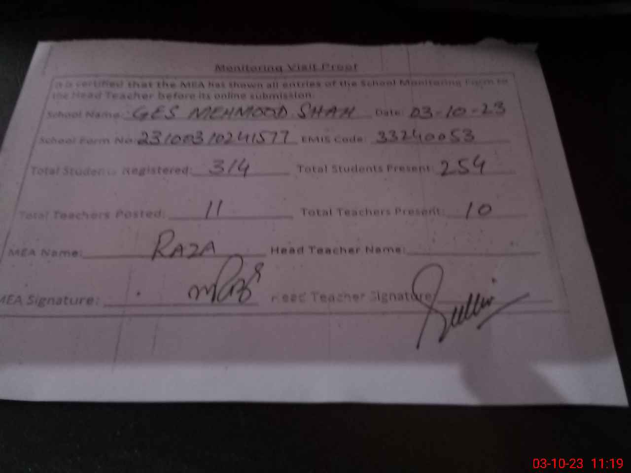 | Attendance Register | Head Teacher | MEA with School | Visit Proof |
